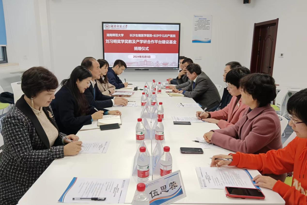 1月5日下午,长沙生殖医学医院·长沙宁儿妇产医院向我校捐赠仪式在我院综合楼228室举行。长沙生殖医学医院·长沙宁儿妇产医院总院长刘习明、总院长办公室主任邓珊艳,湖南师范大学副校长王辉,校友总会·教育基金会秘书长黄丽萍等出席捐赠仪式,我院党委书记鄢朝晖主持仪式。