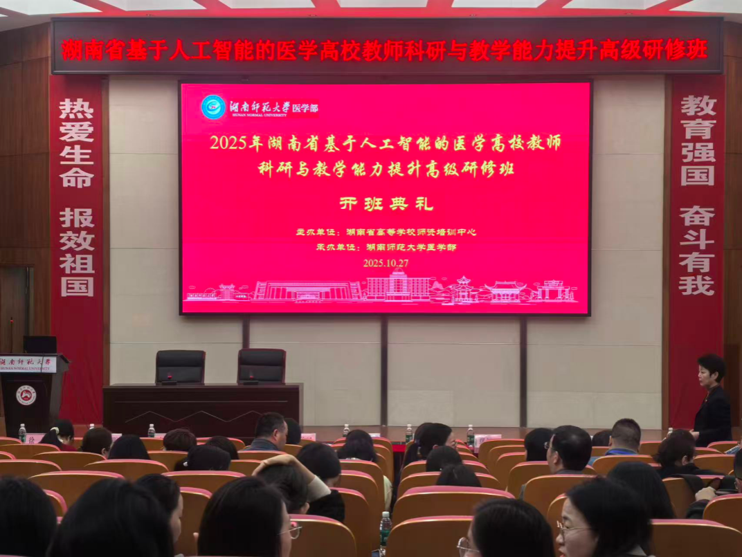 为积极响应国家“健康中国”与“数字中国”战略号召,推动人工智能技术与医学教育深度融合,10月27日上午,由湖南省高等学校师资培训中心主办、湖南师范大学医学部承办的“2025年湖南省基于人工智能的医学高校教师科研与教学能力提升高级研修班”在湖南师范大学医学部学术报告厅隆重举行开班典礼。来自全省46所医学院校、附属医院及疾控机构的140余名骨干教师与研究人员齐聚一堂,共同开启一场关于AI与医学融合发展的学习与探索之旅。