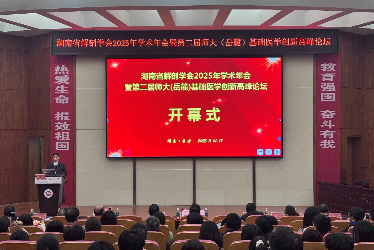 11月15日上午,湖南省解剖学会2025年学术年会暨第二届师大(岳麓)基础医学创新高峰论坛于湖南师范大学医学部学术报告厅顺利开幕。此大会由湖南省解剖学会主办,湖南师范大学医学部承办。医学部党工委书记、主任祝益民教授,中国解剖学会副理事长、河北医科大学原校长崔慧先教授,中国医学科学院、北京协和医学院马超教授,上海交通大学医学院黄雷教授,中国解剖学会副理事长、海南医科大学易西南教授,湖南省解剖学会理事长潘爱华教授等专家学者出席开幕式。