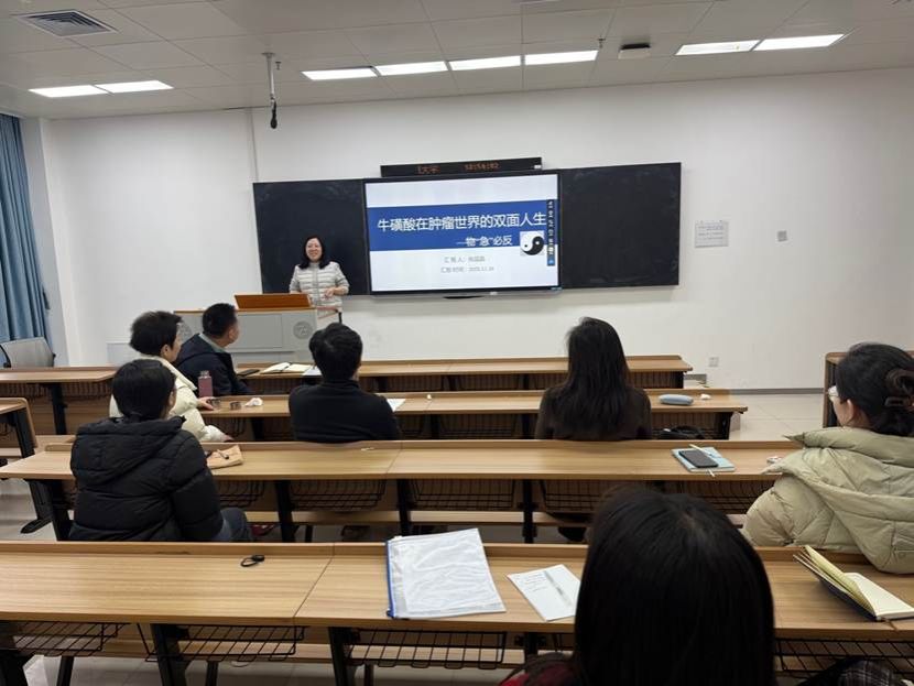 张晶晶老师则以“牛磺酸在肿瘤世界的双面人生——物‘急’必反”为题,以其巧妙的构思,生动讲述了牛磺酸背后的科学故事,并深入探讨了其作为潜在治疗药物在白血病细胞代谢中的双重作用及机制,引发了在场师生的浓厚兴趣。