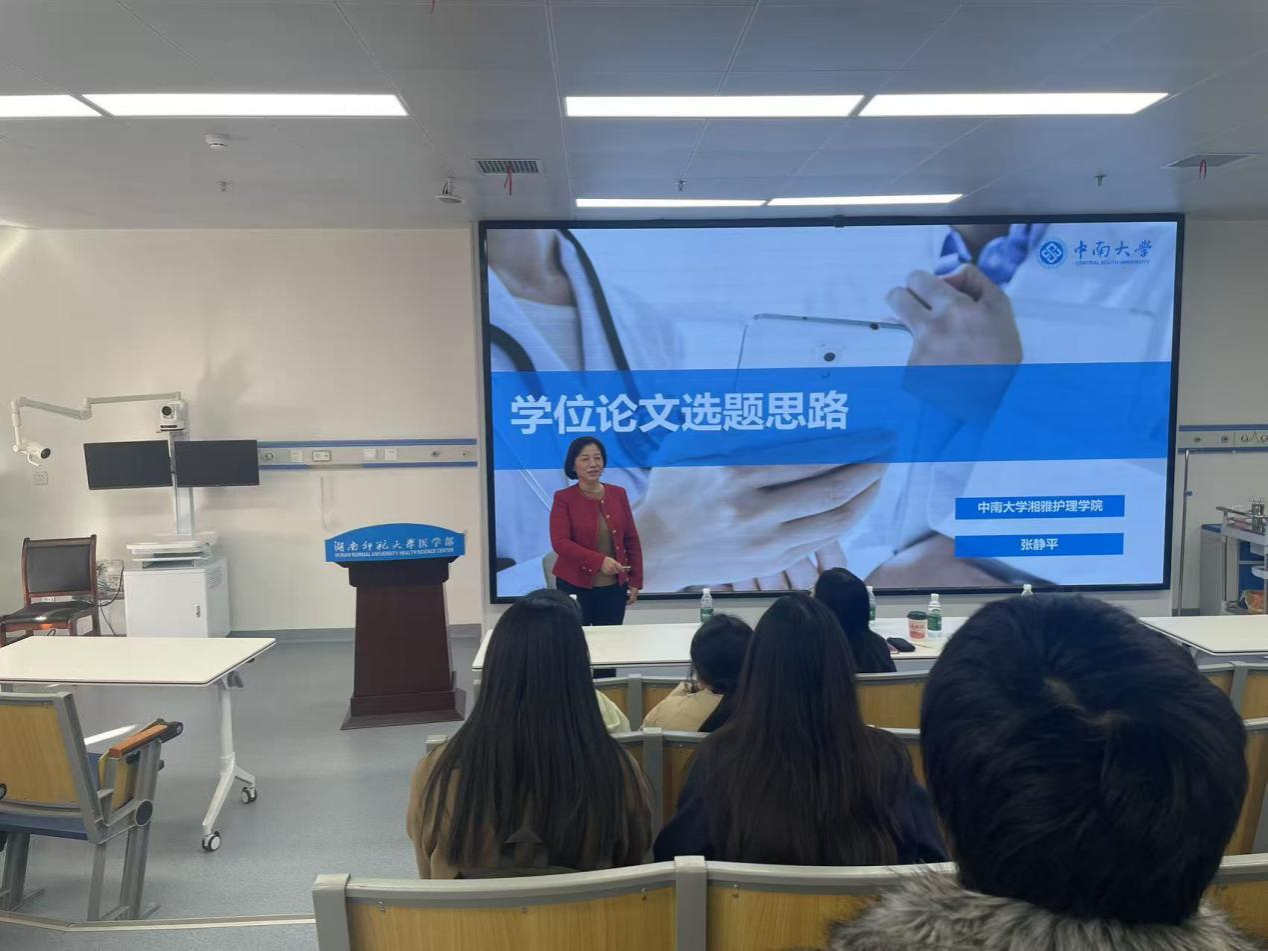 11月25日下午,湖南师范大学护理学院举办学术讲座,特邀中南大学湘雅护理学院二级教授张静平开展题为“学位论文选题思路”的专题分享。讲座由护理学院副院长何平平主持,学院教师、附属医院的临床教师、01及03方向护理学研究生及部分本科生共同参与。