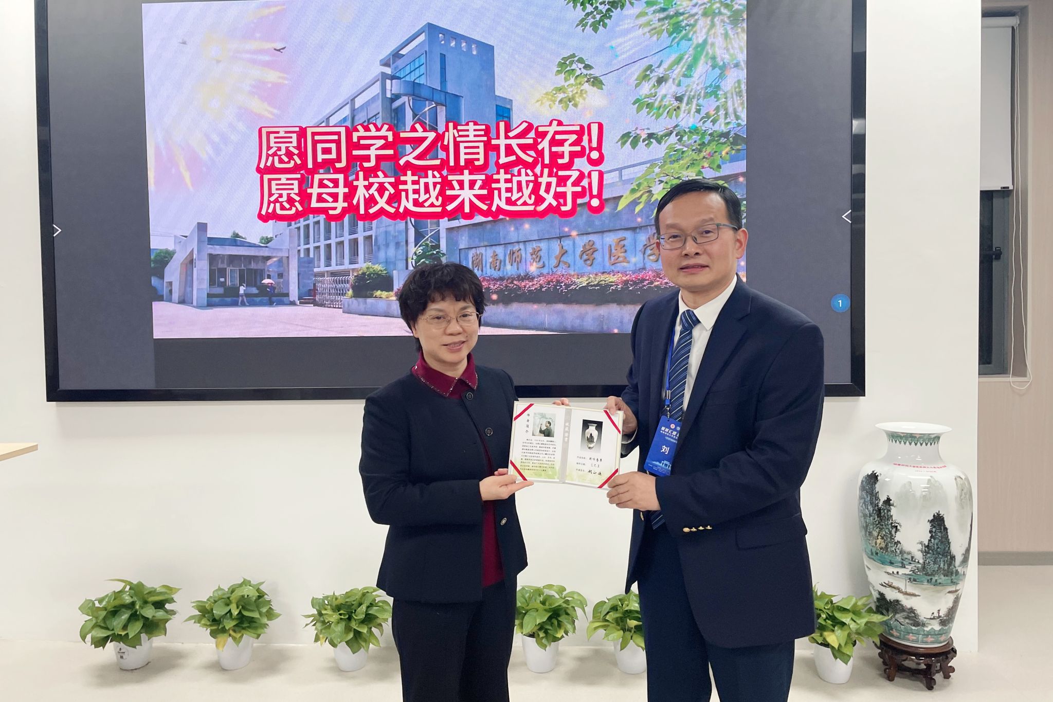 为回馈母校培育之恩,1993级影像专业全体校友共同向医学部捐赠纪念陶瓷瓶一尊,以此铭记同窗情谊、致敬母校育人初心。湖南师范大学医学部党工委副书记鄢朝晖代表医学部接受捐赠,并对校友们的感恩之举表示诚挚感谢。她指出,这尊纪念陶瓷瓶承载着校友们对母校的深厚情谊,是校友与医学部情感联结的重要见证,医学部将永久珍藏,进一步凝聚校友力量、深化校友情谊,推动校地、校企、校友间的协同发展。