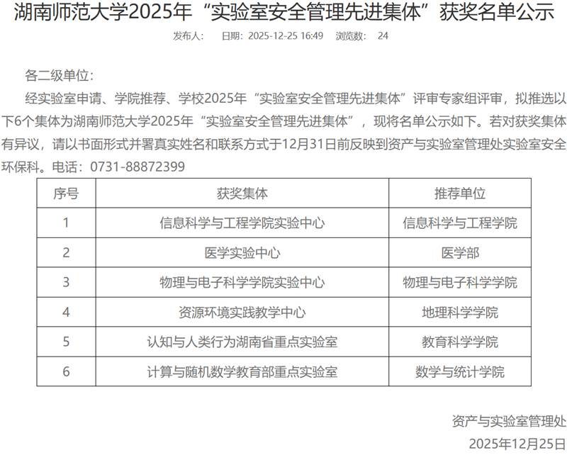 12月25日,湖南师范大学2025年“实验室安全管理先进集体”评选结果公示,医学实验中心成功入选。