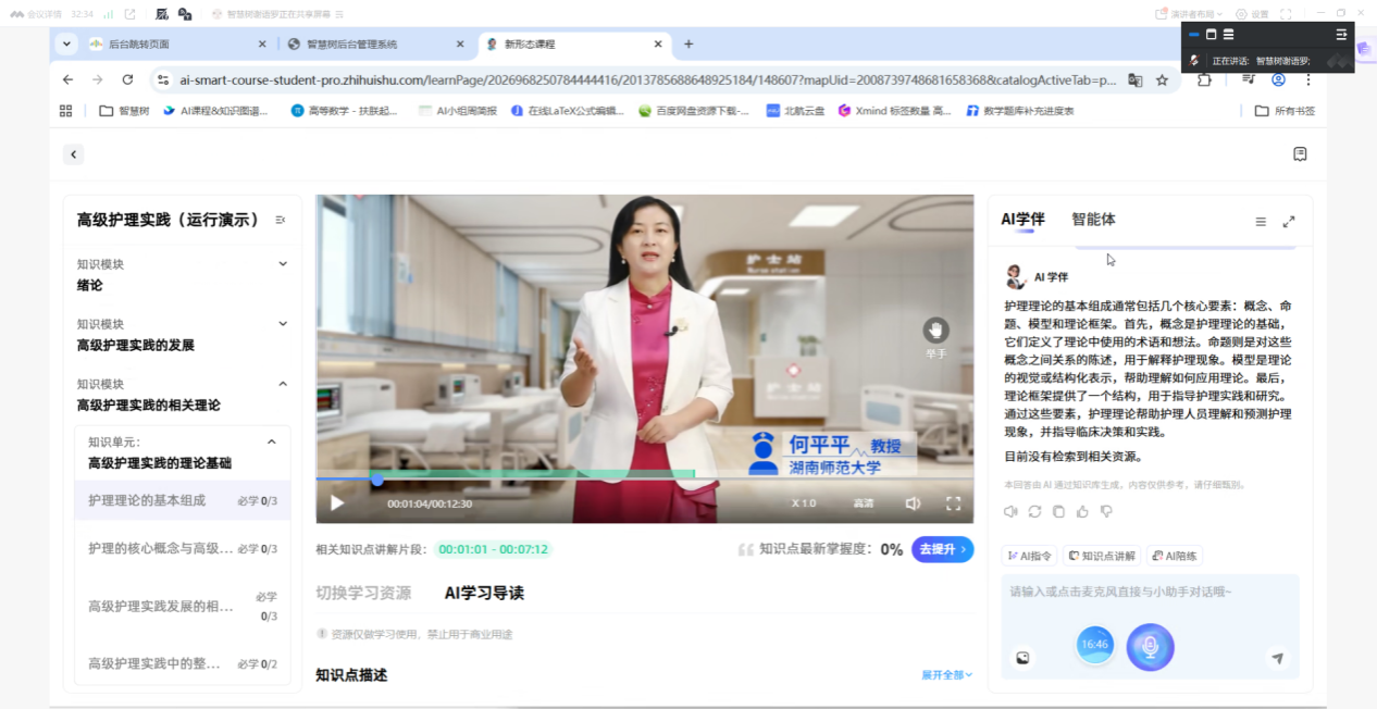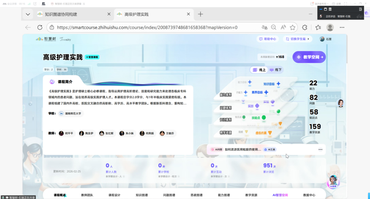 2026年2月26日,《高级护理实践》AI智慧课程建设成果验收会于线上顺利召开。该课程于2025年11月25日获批湖南师范大学研究生AI课程A类立项。为扎实推进课程建设,由湖南师范大学护理学院何平平教授、陶美伊主任护师、王晓芬博士、湖南师范大学附属第一医院(湖南省人民医院)张红辉主任护师、湖南省肿瘤医院朱小妹主任护师、湖南师范大学附属长沙妇幼保健院何燕娟副主任护师组成的教学团队,曾在寒假期间召开过两次线上专项推进会,为本轮验收奠定了扎实基础。