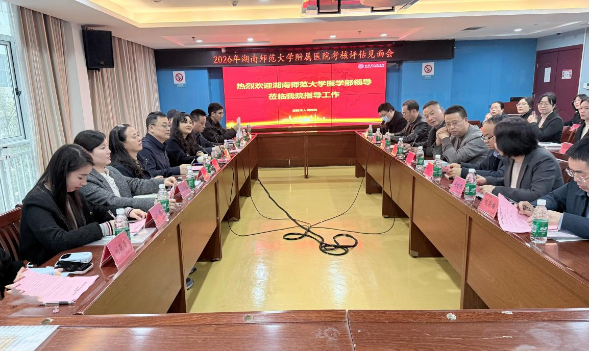 3 月 26 日,医学部考核评估组一行前往湖南师范大学附属岳阳医院(岳阳市人民医院),开展 2025 年度教学科研全面考核评估。本次评估由医学部党工委书记、主任祝益民带队,医院管理处副处长何平平担任组长,岳阳市人民医院党委书记许文杰、院长周仁辉等医院主要领导及相关职能部门负责人、各教研室主任全程参与,双方围绕教学管理、人才培养、学科建设等重点工作开展深入交流。考核评估会由何平平主持。
