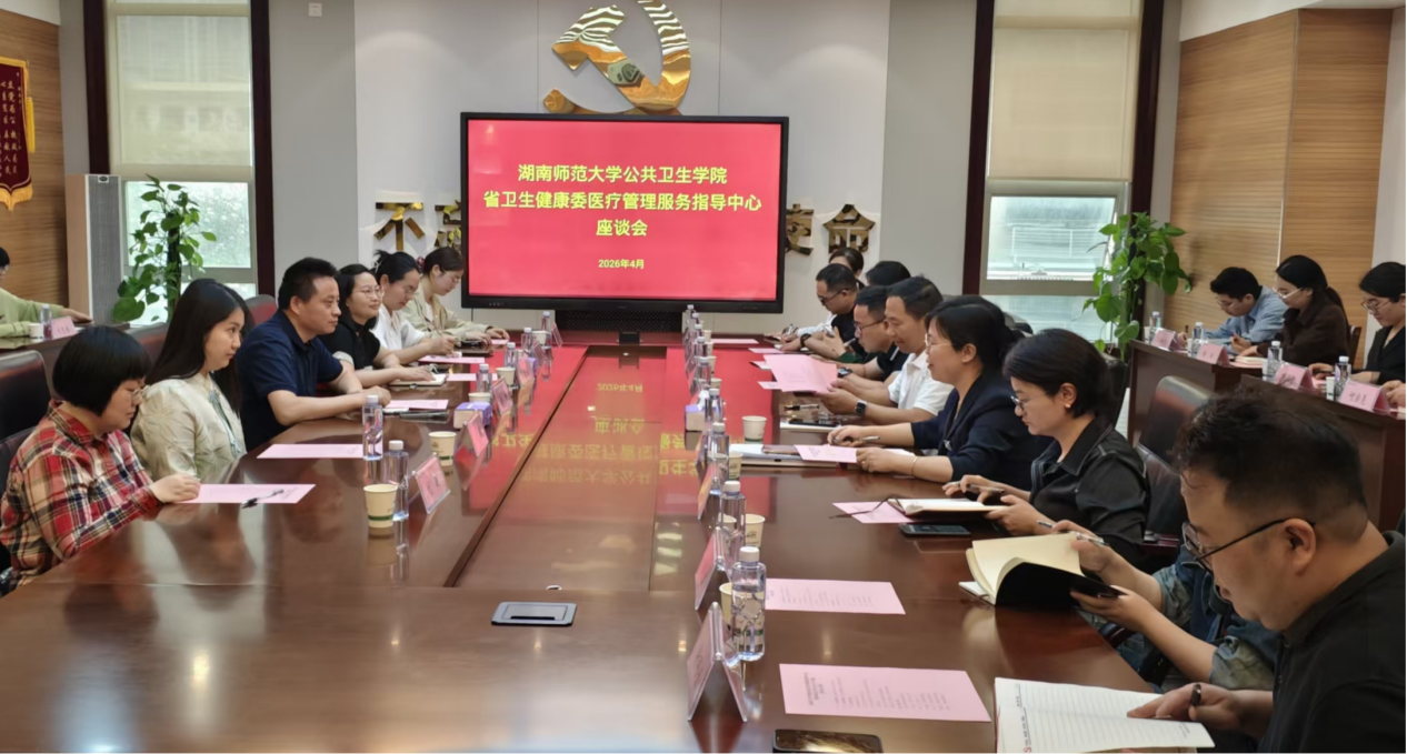 2026年4月9日上午,湖南师范大学公共卫生学院与湖南省卫生健康委医疗管理服务指导中心(以下简称“中心”)在长沙联合召开合作交流座谈会。双方围绕党建共建、业务协同、人才共育、科研合作等主题深入探讨,就推动校地资源共享、优势互补达成广泛共识,为后续深化合作奠定坚实基础。学院相关负责人、教师代表及中心全体人员参加会议。