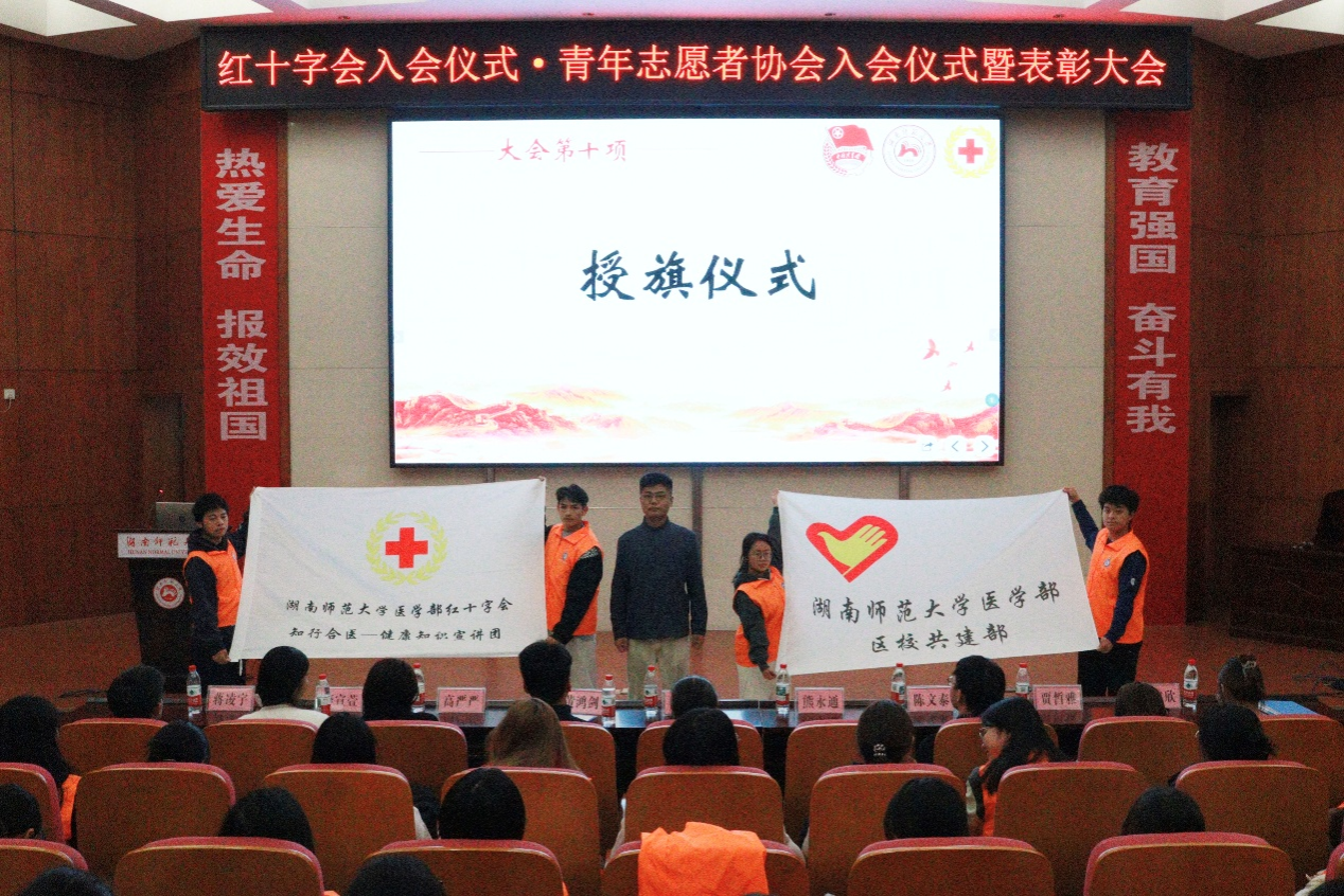 大会最后,陈旭为医学部青年志愿者工作部、红十字会授旗,熊永通为红十字会知行合医健康知识宣讲团、区校共建部授旗,高严严为无偿献血宣传服务队、爱心服务队、红十字会健康咨询队授旗。
