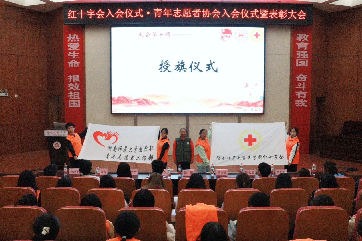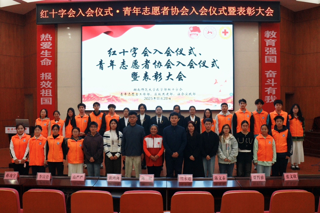 为发扬红十字精神,激发青年学子社会责任感,11月28日中午,医学部开展红十字会入会仪式、青年志愿者协会入会仪式暨表彰大会。此次大会由刘彦歆主持,长沙市红十字会志愿服务队队长、湖南师范大学红十字会特聘指导老师陈旭受邀出席。医学部团委副书记、2023级辅导员黄鸿剑,2025级辅导员高严严、熊永通出席大会。红十字会、青年志愿者协会全体成员以及医学部部分同学参加。