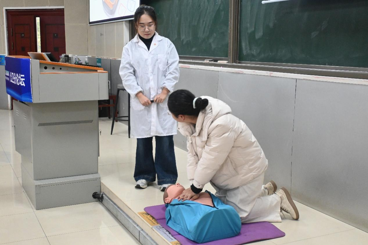 在核心科普展示环节,宣讲团成员为大家讲解了实用健康知识并进行现场实操演示。郝思嘉围绕心肺脑复苏关键要点进行讲解,清晰拆解操作流程与注意事项;高王紫聚焦烫伤、动物咬伤等常见意外伤害,讲授科学处置方法与急救原则;冯靖哲讲解人体常用穴位保健知识,并结合现场示范,让同学们直观掌握穴位定位与简易保健手法。三位成员演示规范,现场互动积极,充分展现了医学青年的专业素养与科普热情。