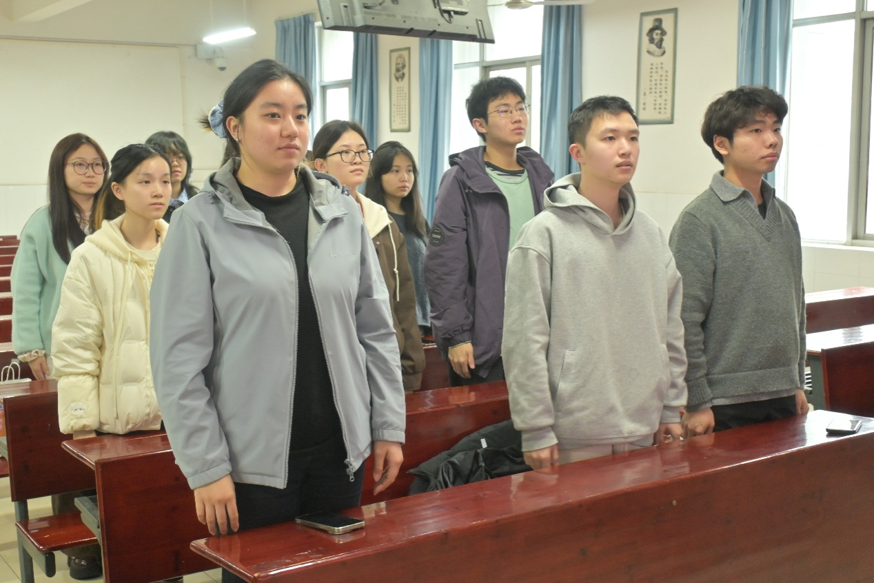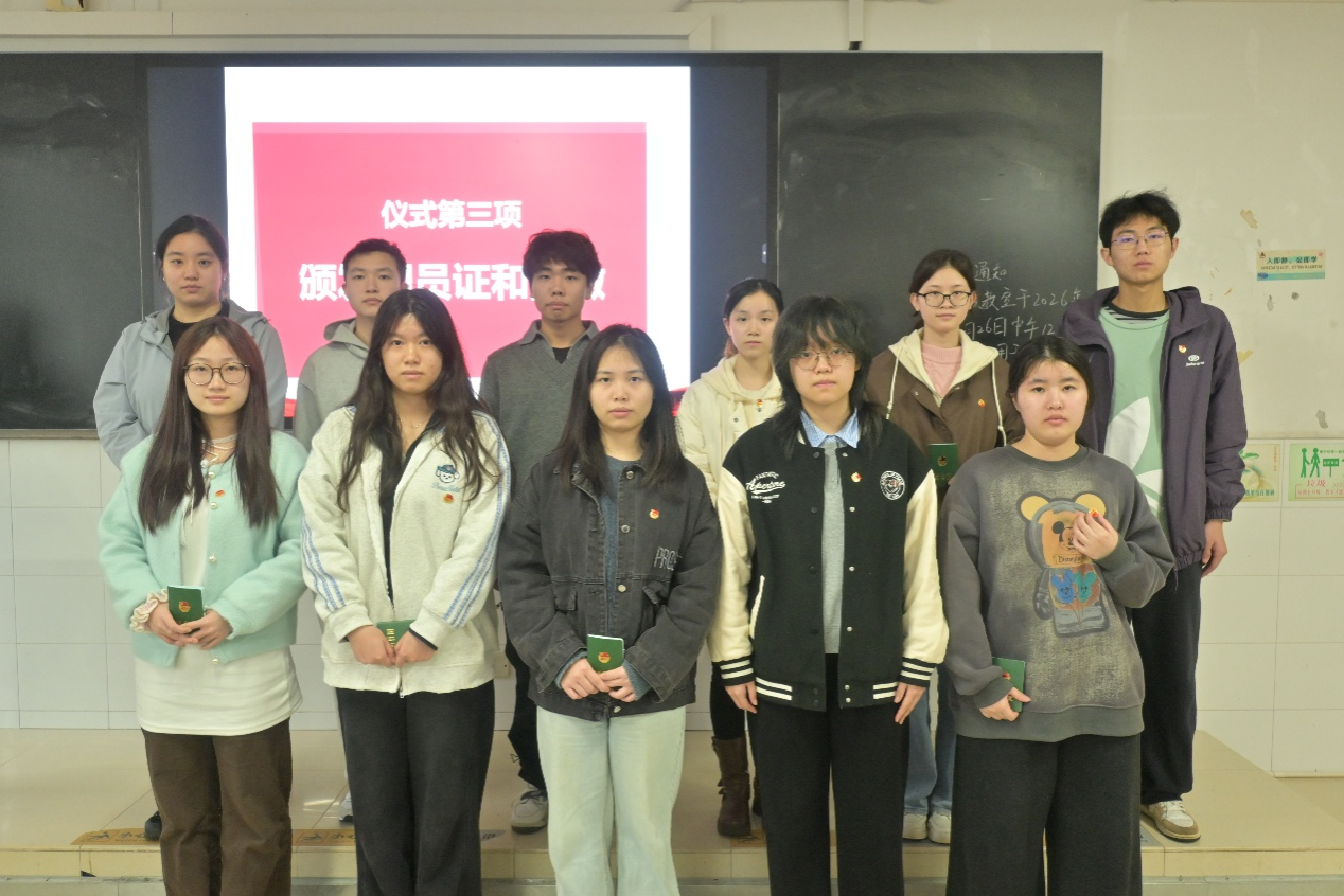 仪式在嘹亮的国歌声中正式开始,全体参会人员肃立,齐唱国歌。国歌奏毕,张笈宣读本次新发展团员名单,新团员依次走到台前,接收团员证并佩戴团徽。随后,全体新团员在组织部志愿者的带领下面向团旗庄严宣誓。张笈表示,希望新发展团员始终牢记团员身份,时刻以团员标准严格要求自己,坚定理想信念,勇于担当作为,在学习和生活中发挥先锋模范作用,并对其入团表示祝贺。最后,全体人员齐唱中国共产主义青年团团歌,入团仪式圆满结束。