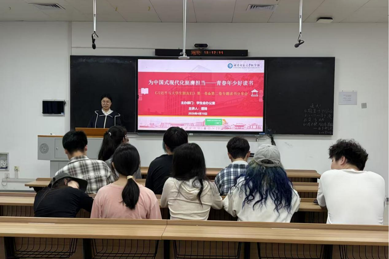 为深入学习贯彻习近平新时代中国特色社会主义思想,引导医学生在阅读中坚定理想信念、汲取奋进力量,以青春之姿挺膺担当,助力中国式现代化建设,2026年4月10日下午18:10-19:00,湖南师范大学医学部学生会办公室于综合楼302教室,面向学生会成员开展“为中国式现代化挺膺担当——青春年少好读书”主题读书分享会活动。
