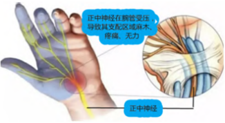 长期过度使用腕部:腕管内压力反复出现变化,将引起正中神经慢性损伤。