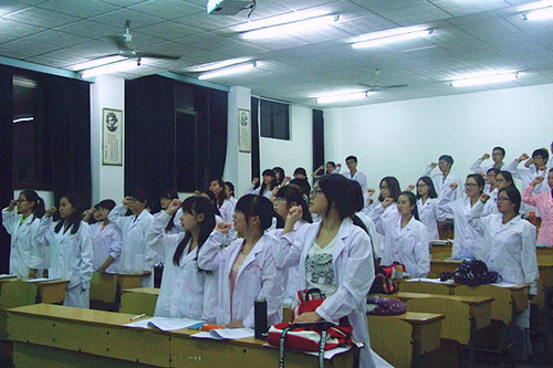 主持人首先宣布穴位保健知识与技能培训班开课仪式正式开始,接着向全班同学介绍了本门课程的授课老师,并强调了班规以及课程考核方法和评优制度。随后,全班同学右手握拳庄严宣誓:健康所系,性命所托,我志愿献身,热爱祖国,忠于人民,恪守医德,尊师守纪,刻苦钻研,孜孜不倦,精益求精,全面发展。我决心竭尽全力,除人类之病痛,助健康之完美,维护医术的圣洁和荣誉,救死扶伤,不辞艰辛,执着追求,为祖国医药卫生事业的发展和人类身心健康奋斗终身!随后,金红老师详细地为同学们介绍了穴位的产生,分类及其命名。最后在老师介绍完此课程的基本内容后便开始了“穴位保健”的第一节课。