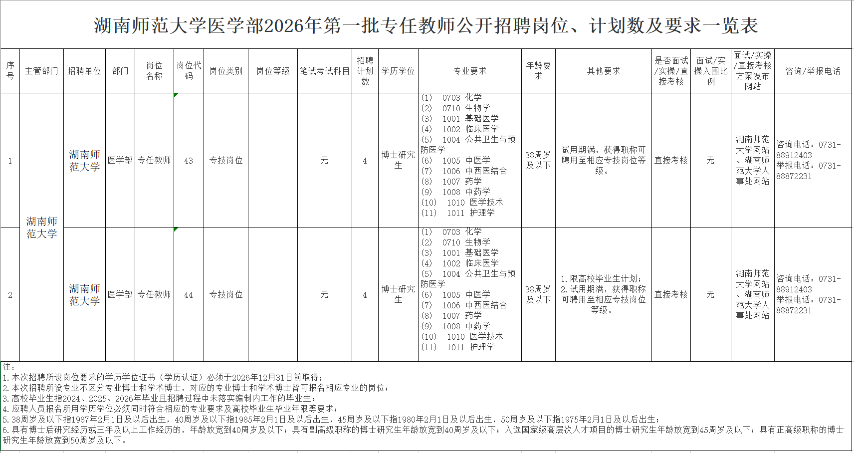 附件:湖南师范大学医学部2026年第一批专任教师公开招聘岗位、计划数及要求一览表.xls