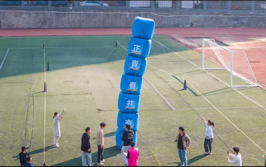 赛场上,欢声笑语与加油呐喊交织成一曲动人的青春乐章。在“运转乾坤”项目中,同学们齐心协力紧握把手,共同托举道具,以整齐划一的步伐和卓越的抗阻能力完成接力奔跑;在“向上向善”项目中,队员们分工协作,依次搭建充气积木,确保标语顺序精准并保持稳固;在“趣味颠球”环节中,队员们手托道具,边行进边颠球,展现出灵动的节奏控制与默契的团队配合;在“趣味连体裤”比赛中,同学们穿着连体道具服,以接力形式协力奔向终点,考验了彼此的协调与默契;在“龙行龘龘”项目中,队员们骑跨在道具上协同前行,以整齐划一的动作完成接力任务;在“激情飞盘”场地,参赛选手将飞盘精准掷向标有不同分数的九宫格,争取最佳积分,现场气氛热烈非凡。每个项目都充满挑战与趣味,不仅锤炼了同学们的身体素质,更凝聚了团队力量,将青春的活力与协作的精神展现得淋漓尽致。