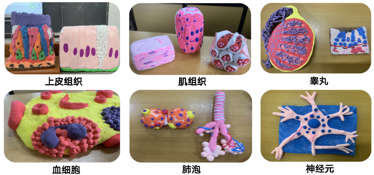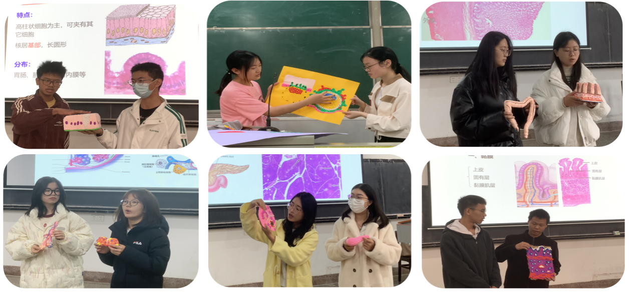 在田玫老师的课堂上,知识不再是枯燥的符号,而是化为学生们深刻的体验。她鼓励同学们使用粘土、泡沫、石膏等制作精美的组织学模型,课中,他们化身小老师,分组进行模型展示和讲解,体验感十足。此外,同学们通过情景剧等方式,进行生生、师生互动,利用肢体语言绘声绘色地模拟组织、细胞形态,既生动又有趣。这些创新实践正是医学部推动“基础-临床贯通、学科-交叉融合”教学改革的生动写照。